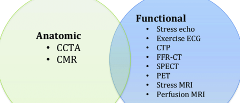 - Comme le Coro-CT, l’examen fonctionel est recommandé suivant l’âge, le sex, et les facteurs de risque (= la probabilité pré-test)