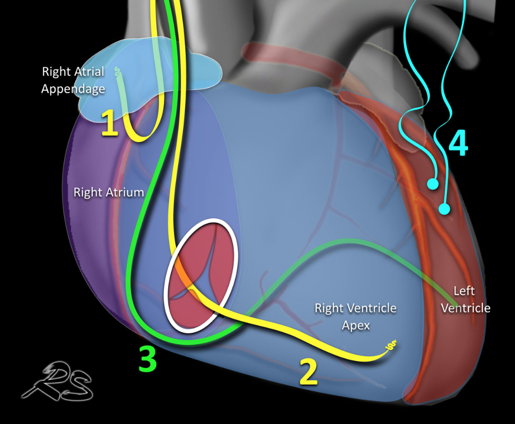 Auricule droit + ventricule gauche + PM ventricule droit avec 2 coils de défibrillation le long du cable