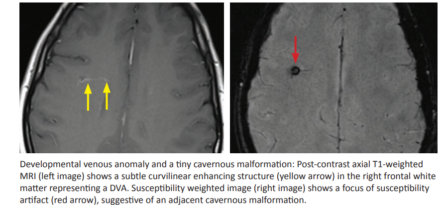 - Malformations vasculaires Low flows (no shunt) = DVA, Telangiectasie capillaire, Cavernome