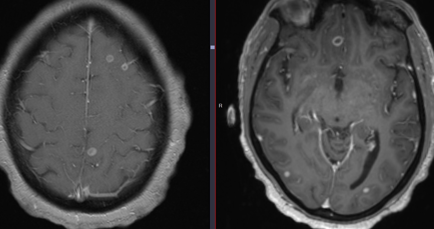 Général Leptoméningite tuberculeuse (prise de contraste leptoméningée) Tuberculomes (abcès avec centre hypoT2) Cas Tuberculomes cerebrale TB neurotoberculose neuro tcb tbc tumerculome tuberculome abcès abscès absces
