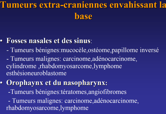 Tumeurs nasales et sinusales → envahissement de la base du crane