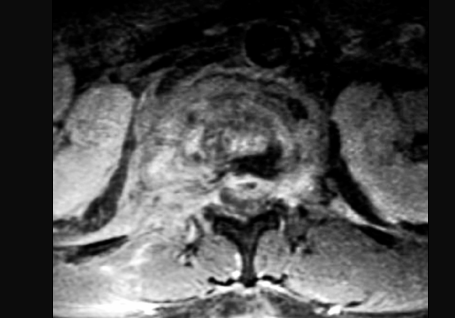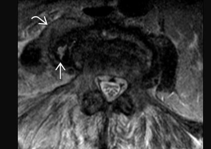 T2WI: heterogeneous collection in the right psoas muscle. Thick, irregular, hypointense rim and central hyperintensity. The right psoas shows diffuse hyperintensity due to edema .