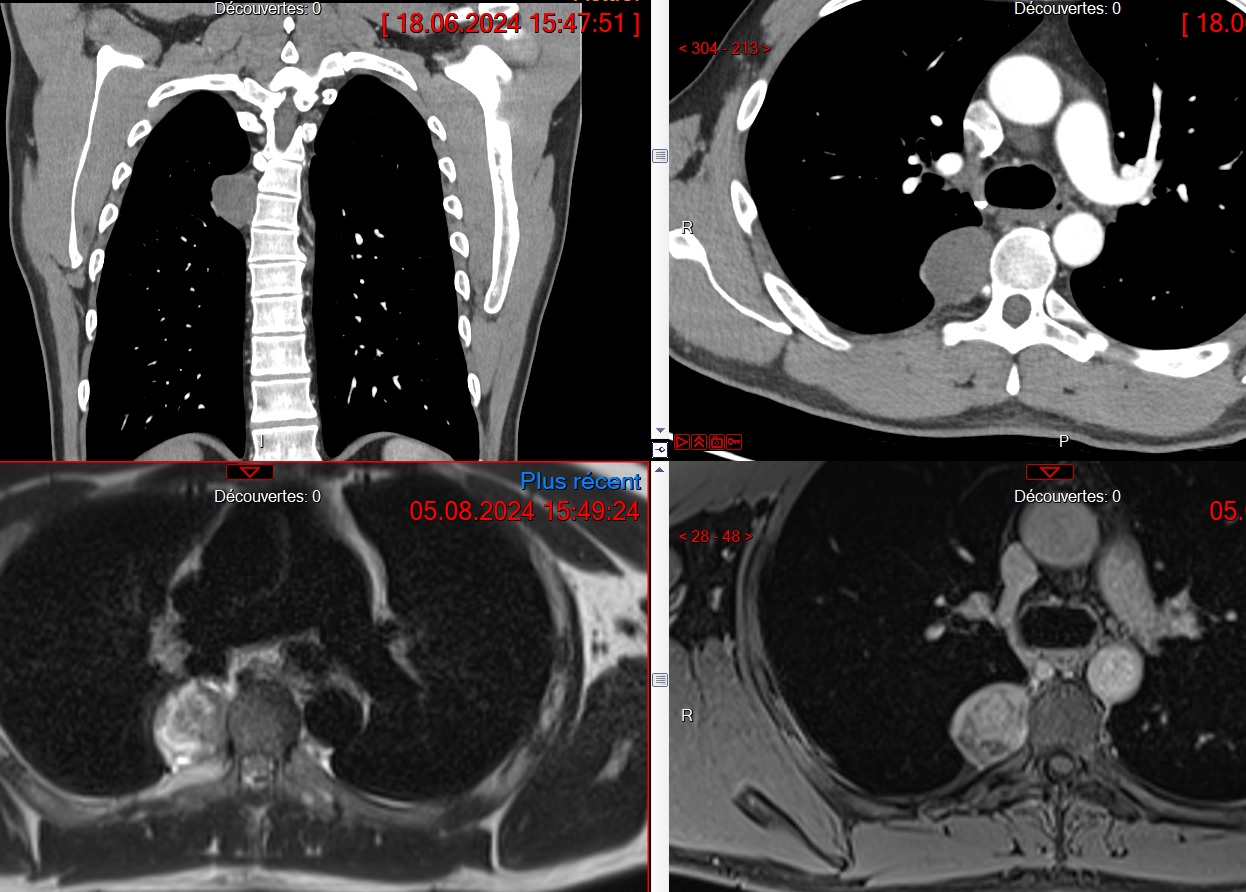 - Invasion médiastinale d’un cancer pulmonaire ++