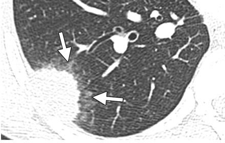 - Si hémorragie: plages de VD, crazy paving ou consolidation