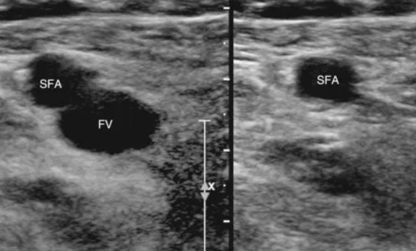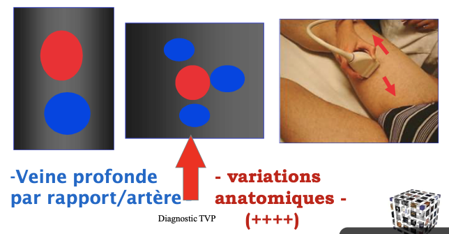 Crosse de la saphène (risque de TVP++ car pas de valve) → Saphène (TVS)