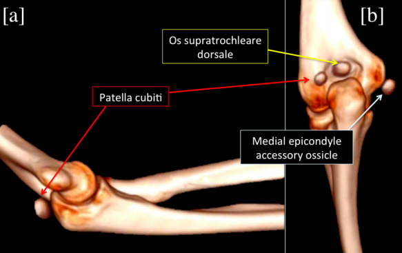 3D reconstructions of the right elbow in lateral flexion [a] and posterior [b] views, depicting elbow ossicles: os patella cubiti [red], os supratrochleare dorsale [yellow] and the medial epicondyle accessory ossicle acromion accessoire accéssoires accéssoire acessoire acéssoire