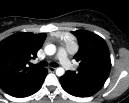 - Masse médiastinale solitaire ou plusieurs adénopathies hypervasculaires